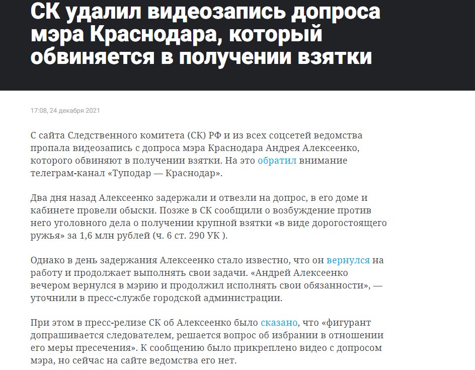 #Внезапно: СК удалил видеозапись допроса мэра Краснодара Андрея Алексеенко, который обвиняется в получении взятки…