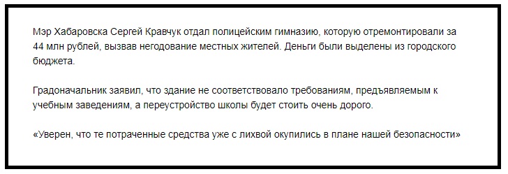 Мэр Хабаровска член «Единой России» Сергей Кравчук отдал отремонтированную за счет городского бюджета (44 миллиона руб.) гимназию под отдел полиции. Якобы, отремонтированное здание школы не соответствует требованиям, хотя до ремонта она соответствовала…